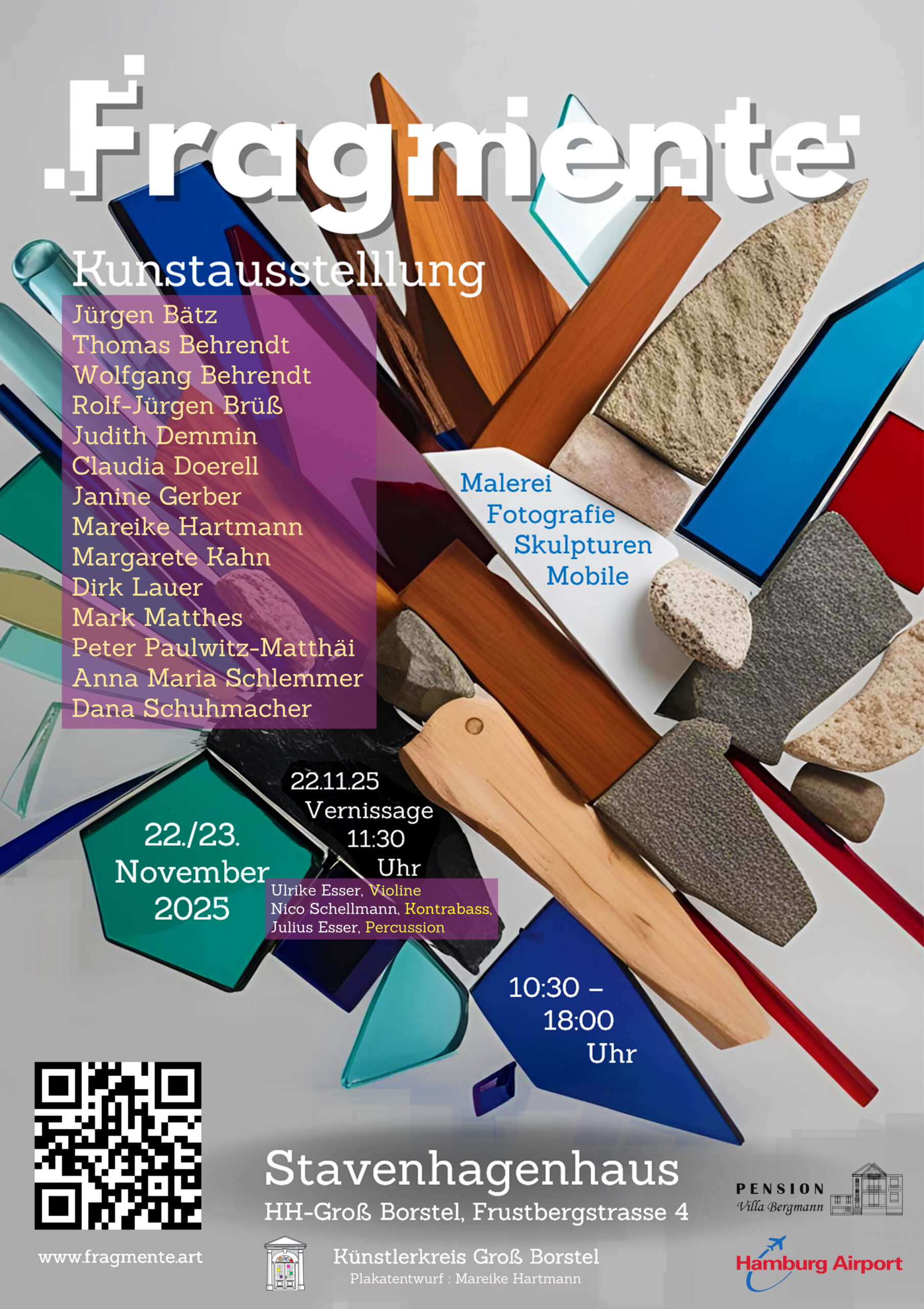 Nach dem erfolgreichen Auftakt im November 2024 lädt der Künstlerkreis Groß Borstel in diesem Jahr erneut zu einer großen Gemeinschaftsausstellung in das Stavenhagenhaus ein. Die Ausstellung trägt den Titel „Fragmente“ und versammelt Werke von insgesamt 14 Künstlerinnen und Künstlern aus Groß Borstel und dem Hamburger Norden – darunter Malerei, Fotografie, Skulpturen und wieder eine große installative Arbeit, ein Mobile im Foyer des Stavenhagenhauses.